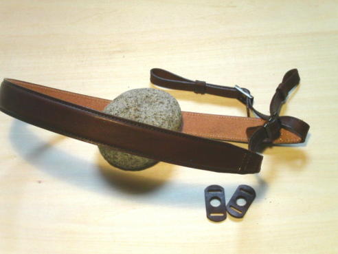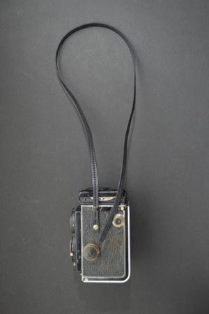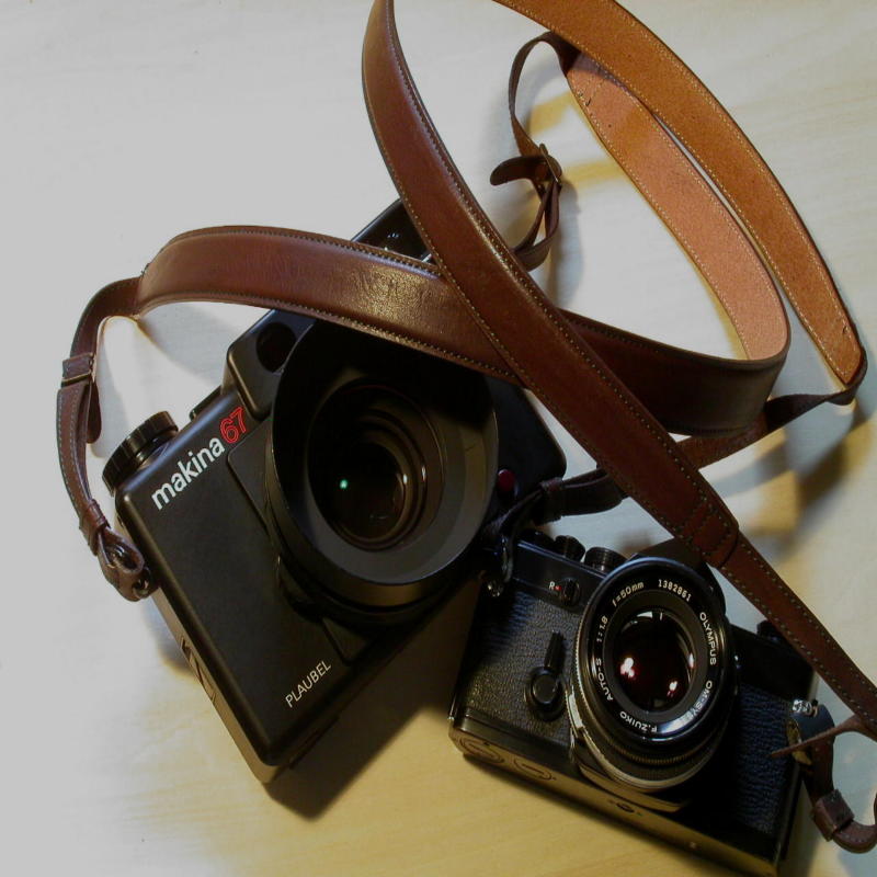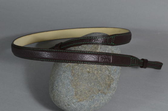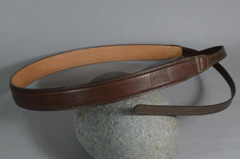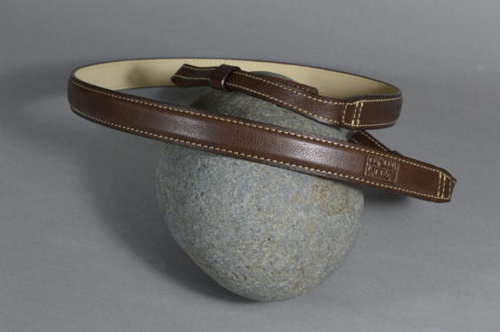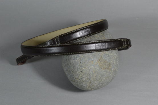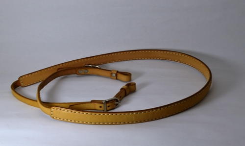 革は従来品と同様、タンニン鞣しで、最高級の革を使用し、オリジナルより厚めにして強度を上げています。 (1)留め具用スリット先端(反対側)穴追加 ストラップ両端の留め具の穴の線の先端にも小さな穴を開けることによって 切り欠きの線が大きくなって裂けてしまうのを防ぎます。 (2)小端に調色追加縁の部分はオリジナルは切りっぱなしになっていますが、 この小端の部分に黒の調色をし、革の毛羽立ちを抑えます。 (3)ストラップ中心部に補強用ステッチ追加し、ストラップの強度を上げると共に個性も際立たせています。 ![]() ![]() \14,000 色:黒、長さ*:約85cm(1m15cm迄延長できます)、幅:約7mm、厚さ:約1,5mm 長さ*:スタンダードローライフレックス用オリジナルは85cmですが、肩掛けなどには1m15cm迄延長できます。