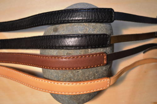 上から順に黒/紺、黒/茶、茶/こげ茶とツートーンが粋です。 一番下の生成りの商品は少し日を当てて、使い込まれた風合いを出しています。 全長:1m30cm(装着時の長さ:1m〜1m5p程) *受注生産となりました。 |